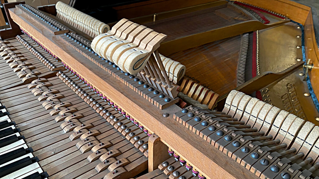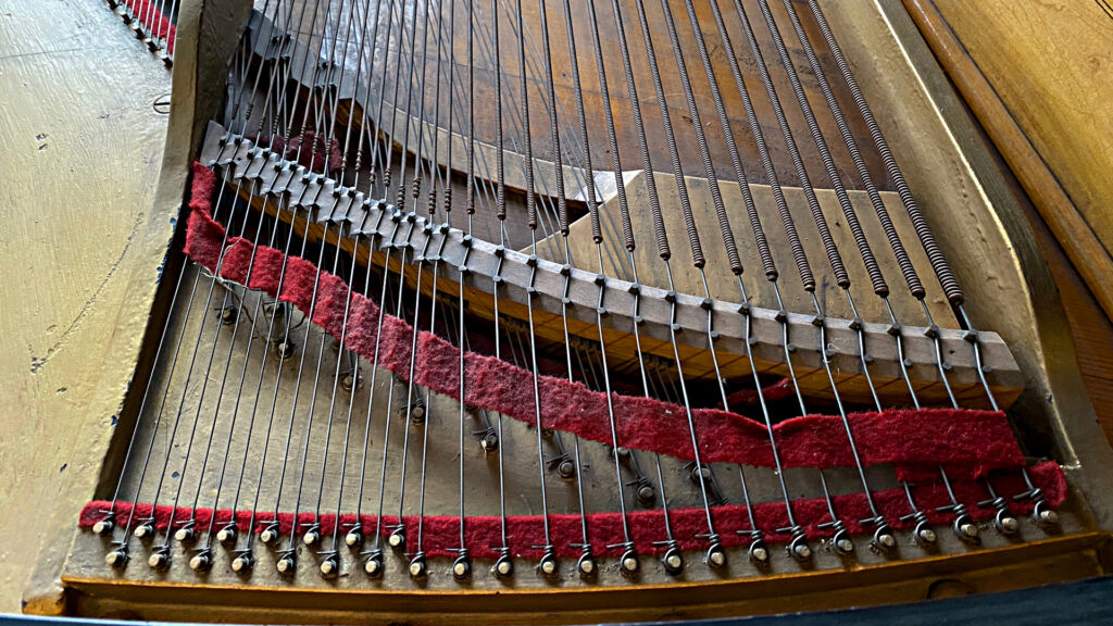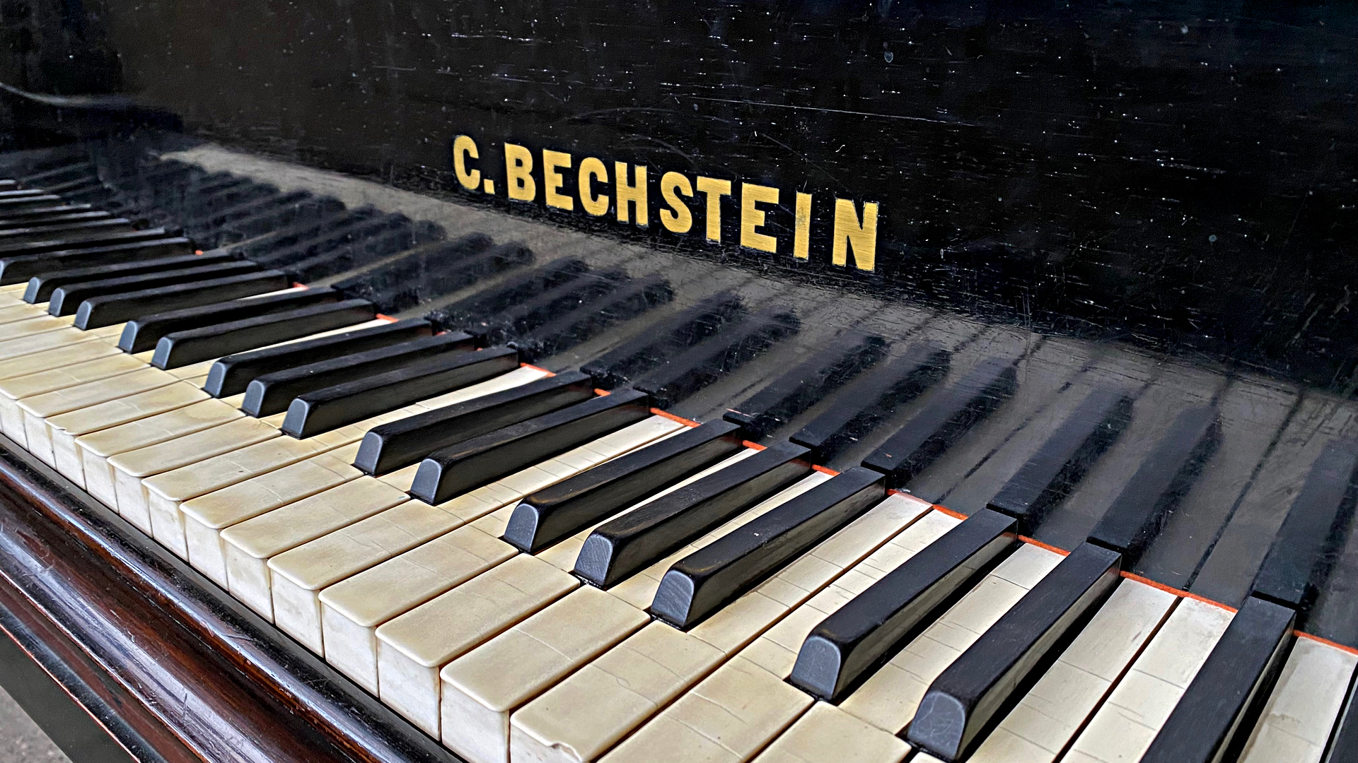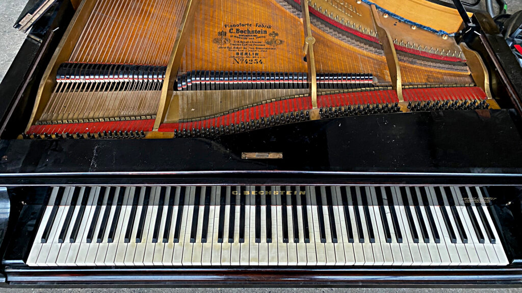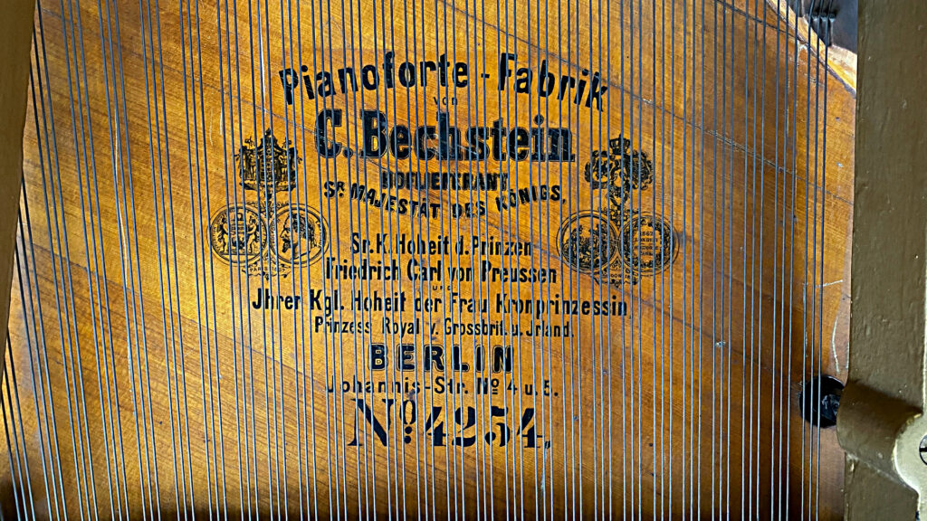 This grand piano, which still looks magnificent, is well preserved for its age. It was apparently refurbished decades ago, including the addition of Elfenit key coverings. At the time, it was delivered by the Dortmund piano manufacturer Franz Reinelt. The grand piano is still playable, but may require restoration.