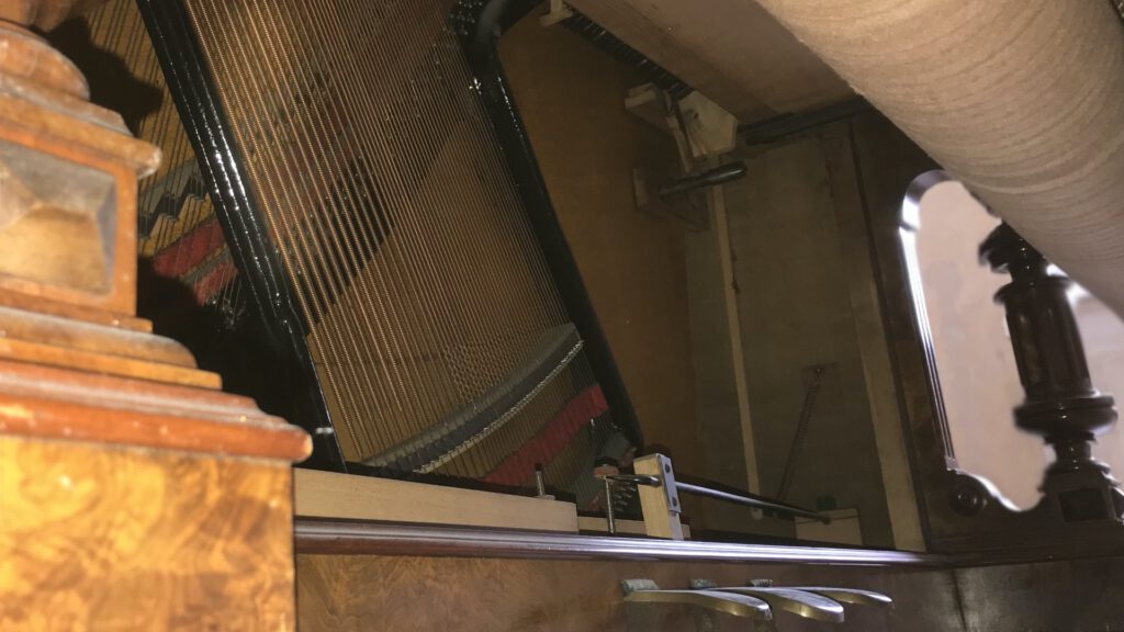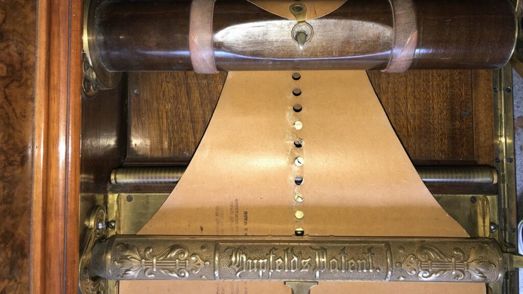 When Ludwig Hupfeld invested far-sightedly in the takeover of the J. M. Grob company at the end of the 19th century, the Hupfeld patent 429419 appeared soon afterwards - the so-called electric piano, which could be operated with a hand crank and also electrically (with coin-box operation, see last photo). The magnificent original electric lamps on the piano are particularly beautiful. Hupfeld's patent 429419 could be installed in any commercially available piano. A special feature: the thick music rolls made of pressboard. These instruments were only available for a short time until around 1902, when the phonola with paper music rolls was introduced. This piano was sold by the music store J. B. Westermair - which was located in Residenzstrasse near the Viktualienmarkt in Munich.