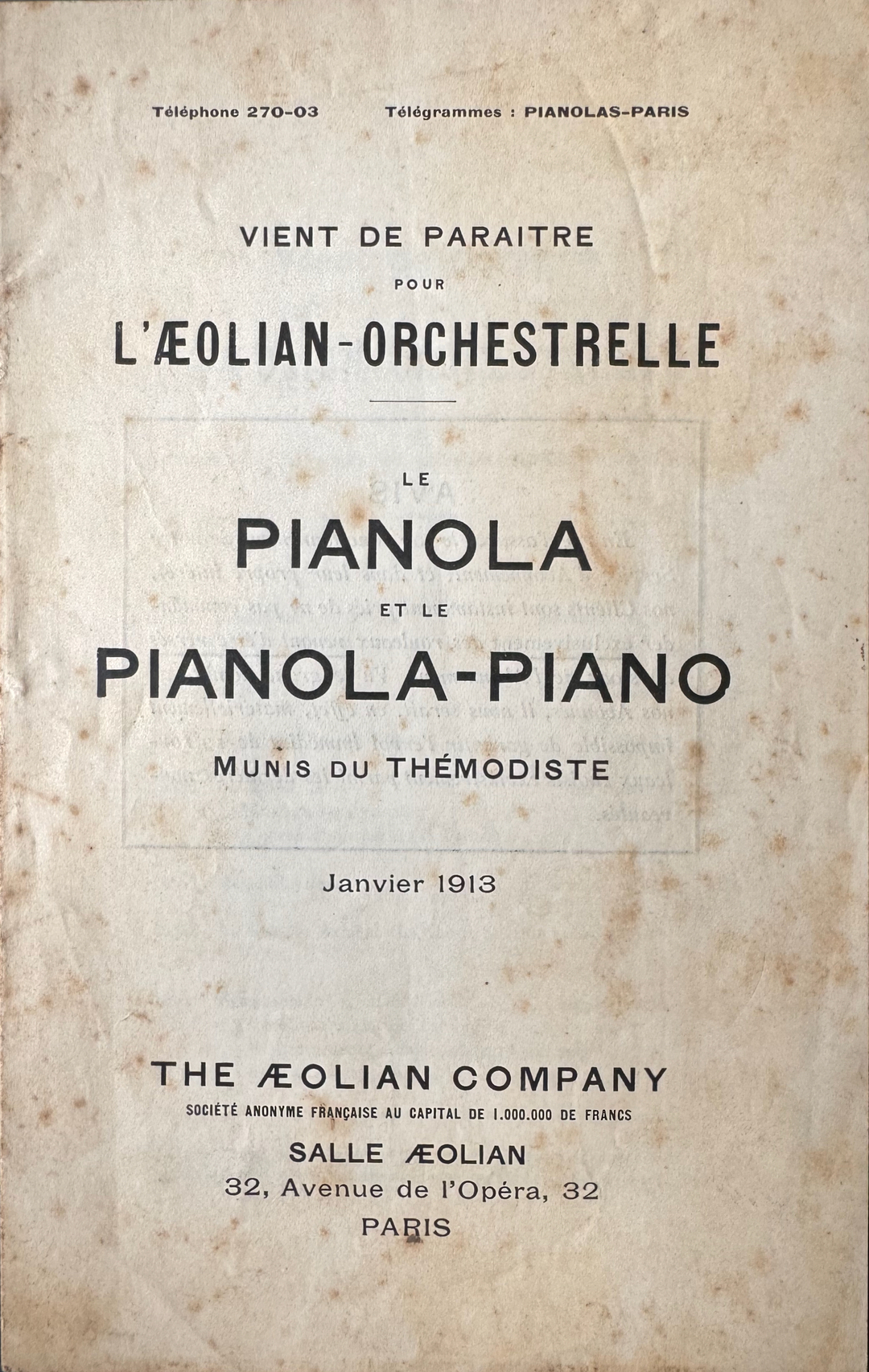 This is a French Aeolian Orchestrelle and 65note Pianola catalog supplement from January 1913 for music rolls. Listed are some 58note orchestrelle rolls, as well as Themodist rolls - sorted by composer. This catalog supplement has about 16 pages. We offer a pdf copy of this rare catalog for research purposes for EUR 25,00. If you are interested, please send us a request..