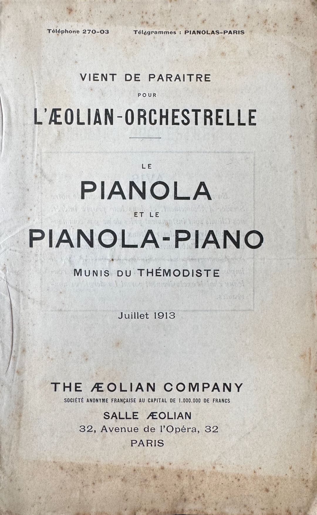 This is a French Aeolian Pianola catalog supplement from July 1913 for music Orchestrelle and Pianola rolls. Listed are some 58 Orchestrelle music rolls, as well as many Themodist and Pianola music rolls - sorted by composer. This catalog has about 20 pages. We offer a pdf copy of this rare catalog for research purposes for EUR 25,00. If you are interested, please send us a request..