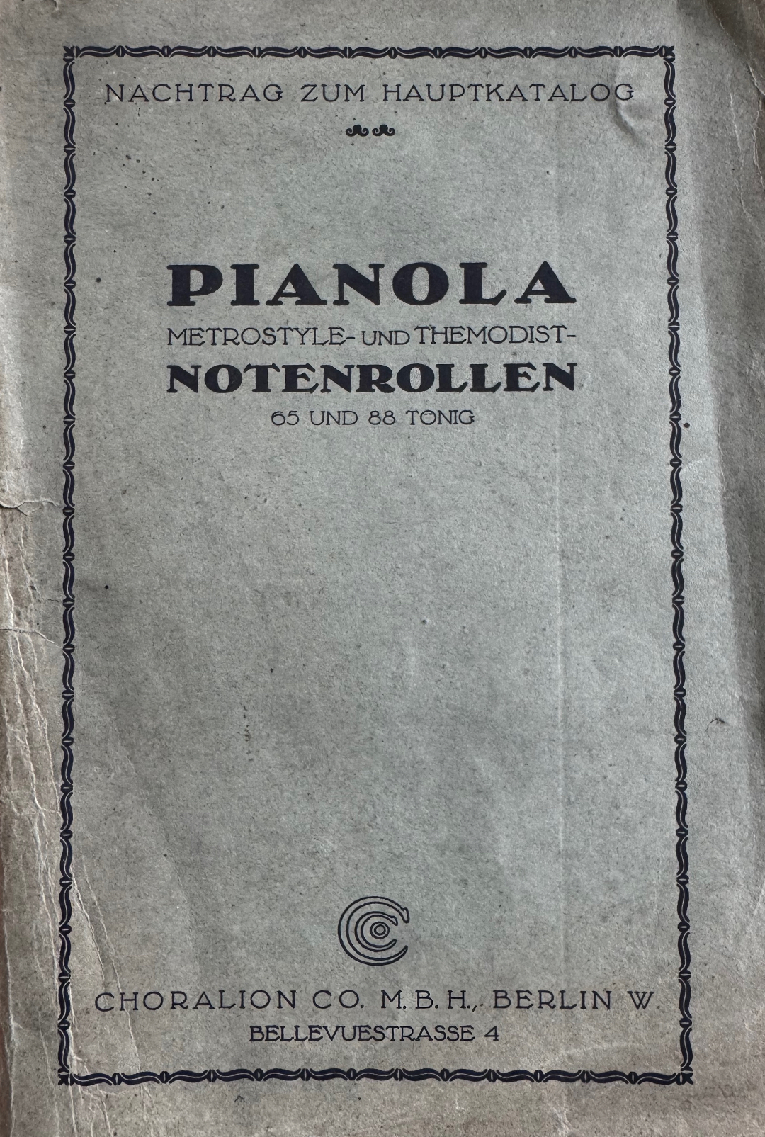 This is a Choralion Pianola music roll supplement probably from 1914 for music rolls in 65 and 88 format. Listed are some autograph rolls (artist rolls), as well as Metrostyle and Themodist rolls - sorted by composer and musical genre. This supplement catalog has about 19 pages. The paper looks as if this catalog has been exposed to great heat. We offer a pdf copy of this rare catalog for research purposes for EUR 25,00. If you are interested, please send us a request..