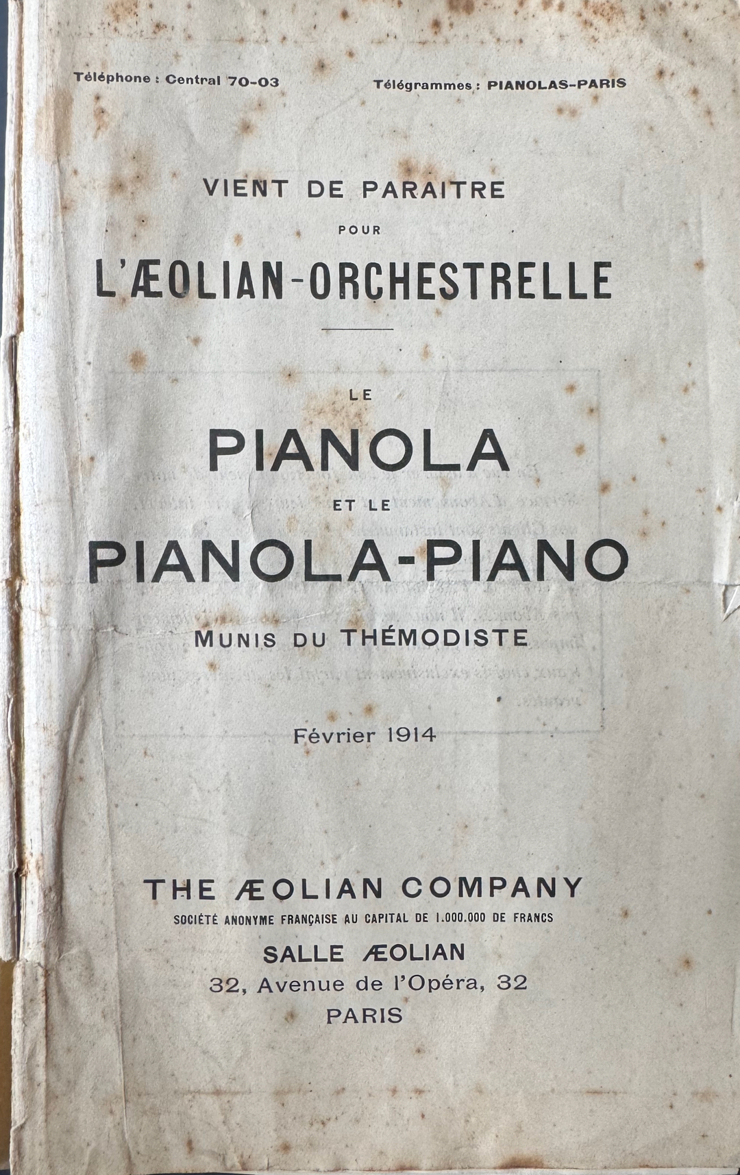 This is a French Aeolian Pianola supplement from February 1914 for music rolls. Listed are music rolls for the orchestral rolls, as well as Themodist rolls - sorted by composer. This catalog supplement has about 11 pages. We offer a pdf copy of this rare catalog for research purposes for EUR 25,00. If you are interested, please send us a request..