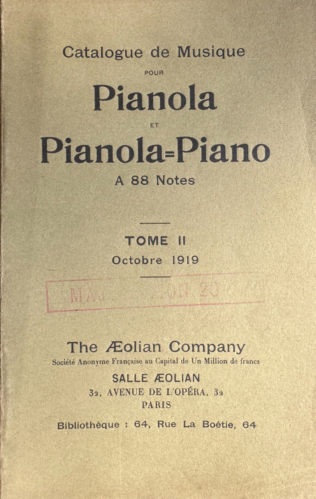 This is a French Aeolian Pianola music roll catalog from October 1919, replacing the January 1913 edition, listing some autograph music rolls, as well as Metrostyle, Themodist and accompaniment rolls - sorted by composer. This catalog has about 152 pages. We offer a pdf copy of this rare catalog for research purposes for EUR 75,00. If you are interested, please send us a request..