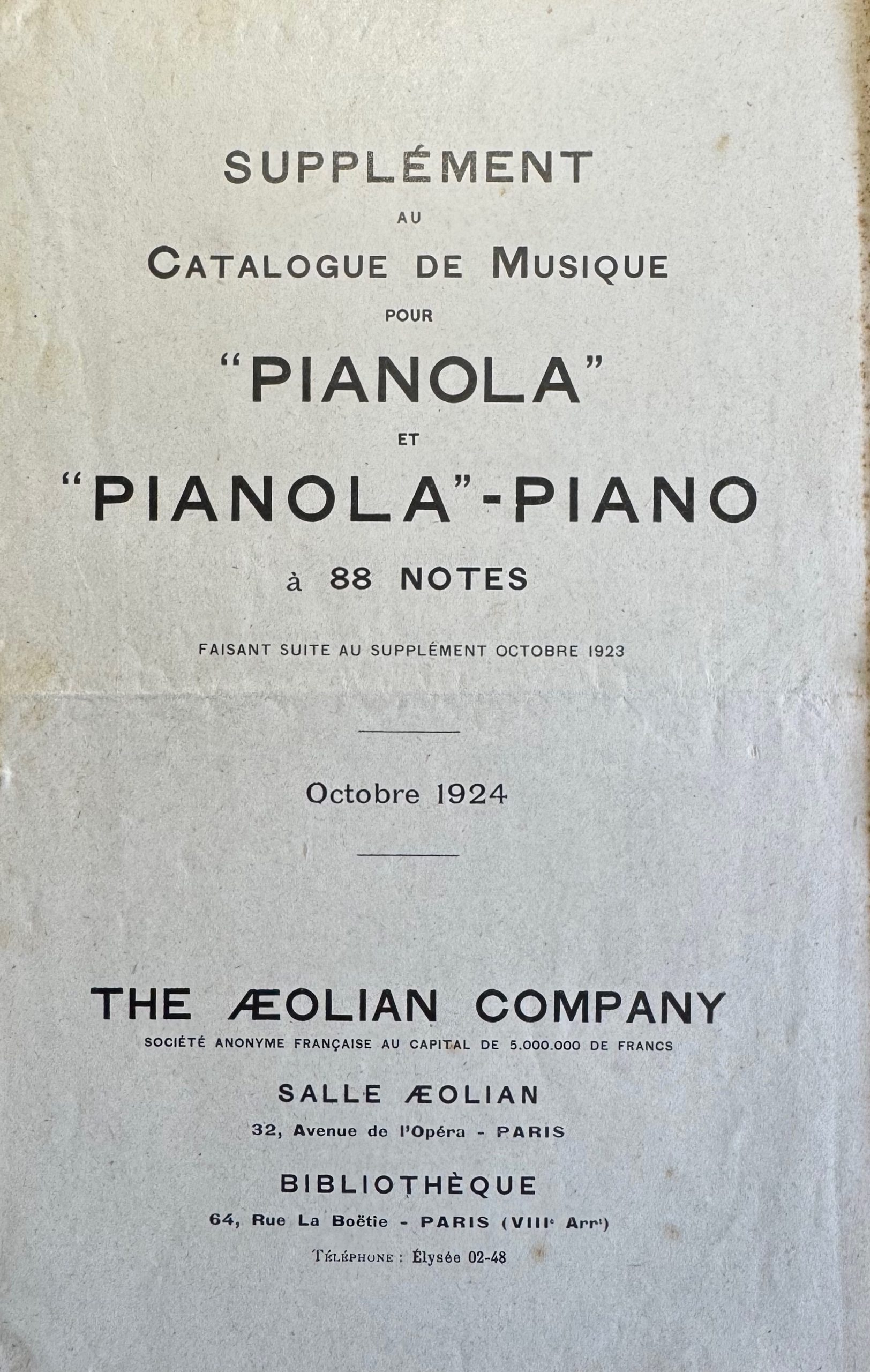 This is a French Aeolian Pianola supplement from October 1924 for 88note rolls - following the supplement from October 1923. Listed are music rolls sorted by composer. This catalog has about 7 pages. We offer a pdf copy of this rare supplement for research purposes for EUR 25,00. If you are interested, please send us a request..
