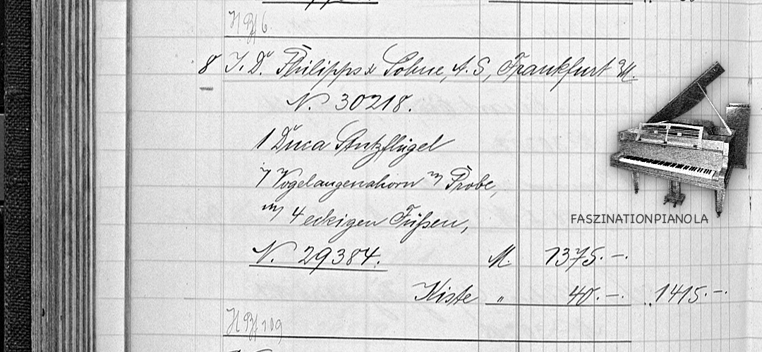 We look for details in the original documents on your Feurich piano, such as the date of delivery, design, price, etc. - and to which address it had been delivered, such as Welte, Hupfeld, Popper, Gebr. Weber, etc. - to create a certificate.