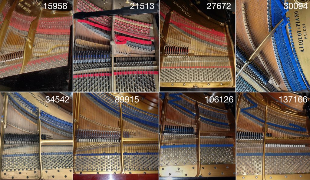 Ganz allgemein geben Seriennummernlisten -soweit diese überhaupt noch erhalten sind- nur einen ungefähren Zeitpunkt als Herstellungsjahr an, auch abhängig davon, wann der Hersteller die Nummern während der Produktion vergeben hat, also z.B. bei Herstellung eines Rahmens, der Raste oder erst bei der sogenannten ‚Hochzeit‘, d.h. der Zusammenführung von Raste und Rahmen, etc.. Nicht selten wurde auf Vorrat gearbeitet und erst später ein Bauteil erst- oder wieder-verwendet, wodurch sich ebenfalls auffällige Abweichungen ergeben können. Der Zeitpunkt der Auslieferung in die eigenen Verkaufsräume oder zu einem der Händler lag i.d.R. später und auch damals schon standen neue Instrumente teilweise lange im Verkauf, bis diese erstmals verkauft wurden. Eine Seriennummer gibt also nicht immer einen exakten Zeitpunkt der Fertigstellung an. Zudem gab es im Piano Gebrauchthandel im 19. und frühen 20. Jahrhundert schon die Praxis Seriennummern nachträglich zu verändern, um ein Instrument jünger und damit wertvoller anbieten zu können. Hier ein Beispiel eines schlecht manipulierten Blüthner Instrumentes in unserem Bestand.