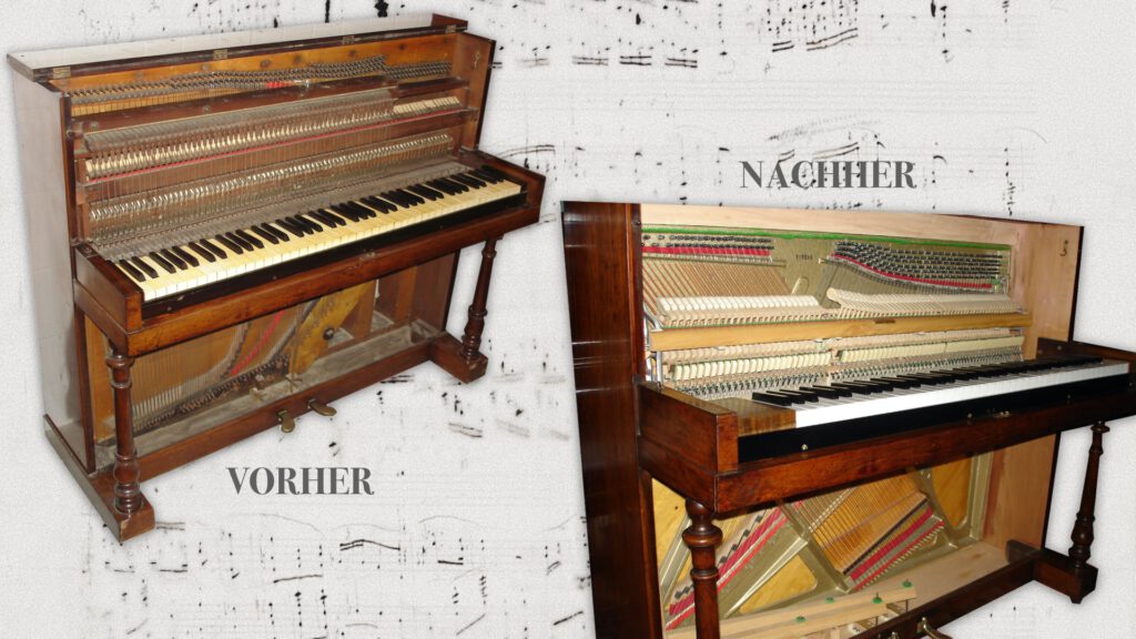 Hier ein Beispiel für den Einbau eines modernen Pianos in einen historischen Korpus. Kundenwunsch war, in diesen schönen Broadwood & Sons Piano Korpus ein zeitgemäßes Klavier einzubauen. Neben optischen Präferenzen ging es hier vor allem darum, die sehr zierlichen Maße des Pianos zu erhalten – denn mit nur 1,25m Breite passte dieses Piano genau in den einzig dafür vorgesehenen Stellplatz.