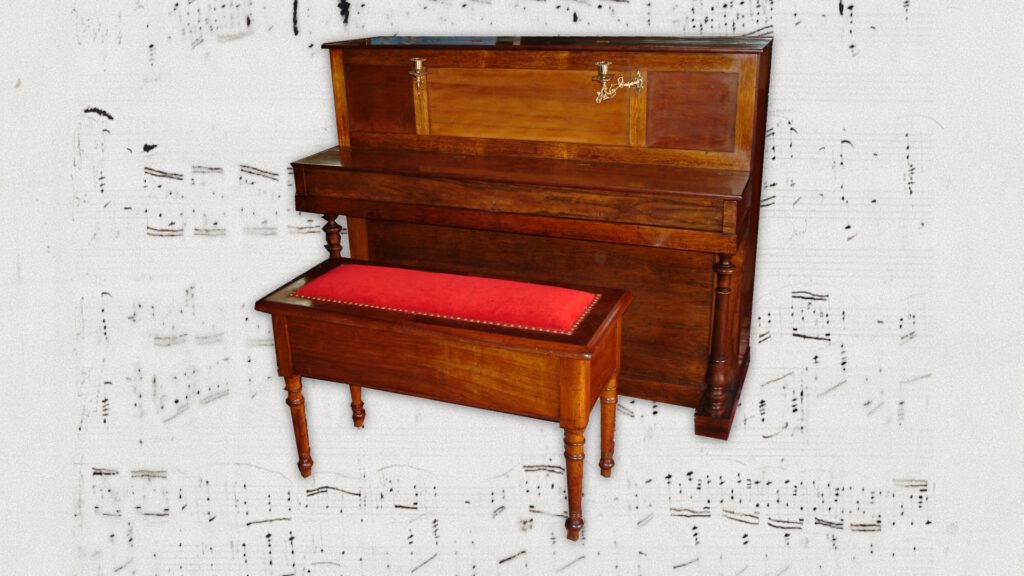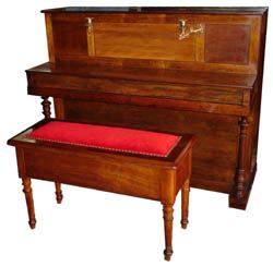 Grundlage war das original erhaltene -jedoch nach Sammlergesichtspunkten nicht erhaltensnotwendige- John Broadwood & Sons Klavier aus 1874. Nach längerer Suche und verschiedenen Versuchen fanden wir ein modernes Bentley Kleinklavier, welches exakt die notwendigen Ausmaße für den Einbau besaß – und gleichzeitig klanglich und technisch unter den verfügbaren Kleinstklavieren den Vorstellungen entsprach. Die Umbauarbeiten waren komplex und wurden von einer auf Piano Umbauten spezialisierten Werkstatt durchgeführt. Die Herausforderung steckte vor allem in den -durch die ~120Jahre Altersunterschied zwischen diesen beiden Klavieren- sehr verschiedenen Detailmaßen der Mechanik und Klaviatur. Allein die Tastenlänge war um 14cm unterschiedlich und die Spieltischhöhe um knapp 10cm. Im Ergebnis jedoch zeigte sich, dass sich die aufwendigen Arbeiten gelohnt haben. Das Klavier mit seinen seltenen originalen Leuchtern und dem typischen Aussehen der Zeit um 1874 passte perfekt in die dafür vorgesehen Nische – und erklingt nun bei zeitgemäßer 440Hz Kammertonstimmung wieder schön. Dieses besondere Instrument steht jetzt in einem Haus an einem herrlichen See tief in den Schweizer Bergen. Passend zum Klavier wurde eine Klavierbank ausgesucht und ebenfalls restauriert – inkl. der Aufpolsterung und dem Bezug nach alter Polstertechnik.