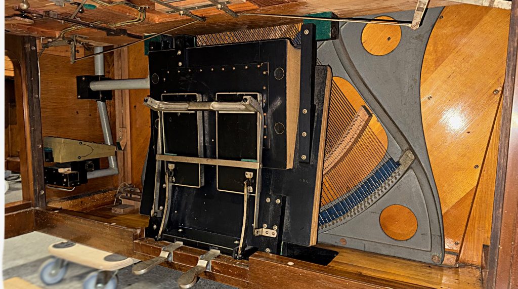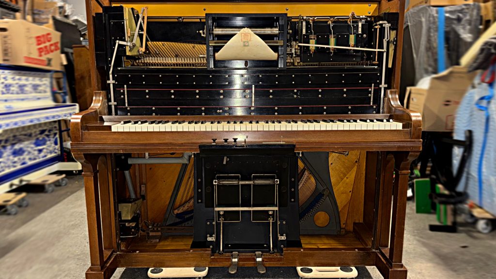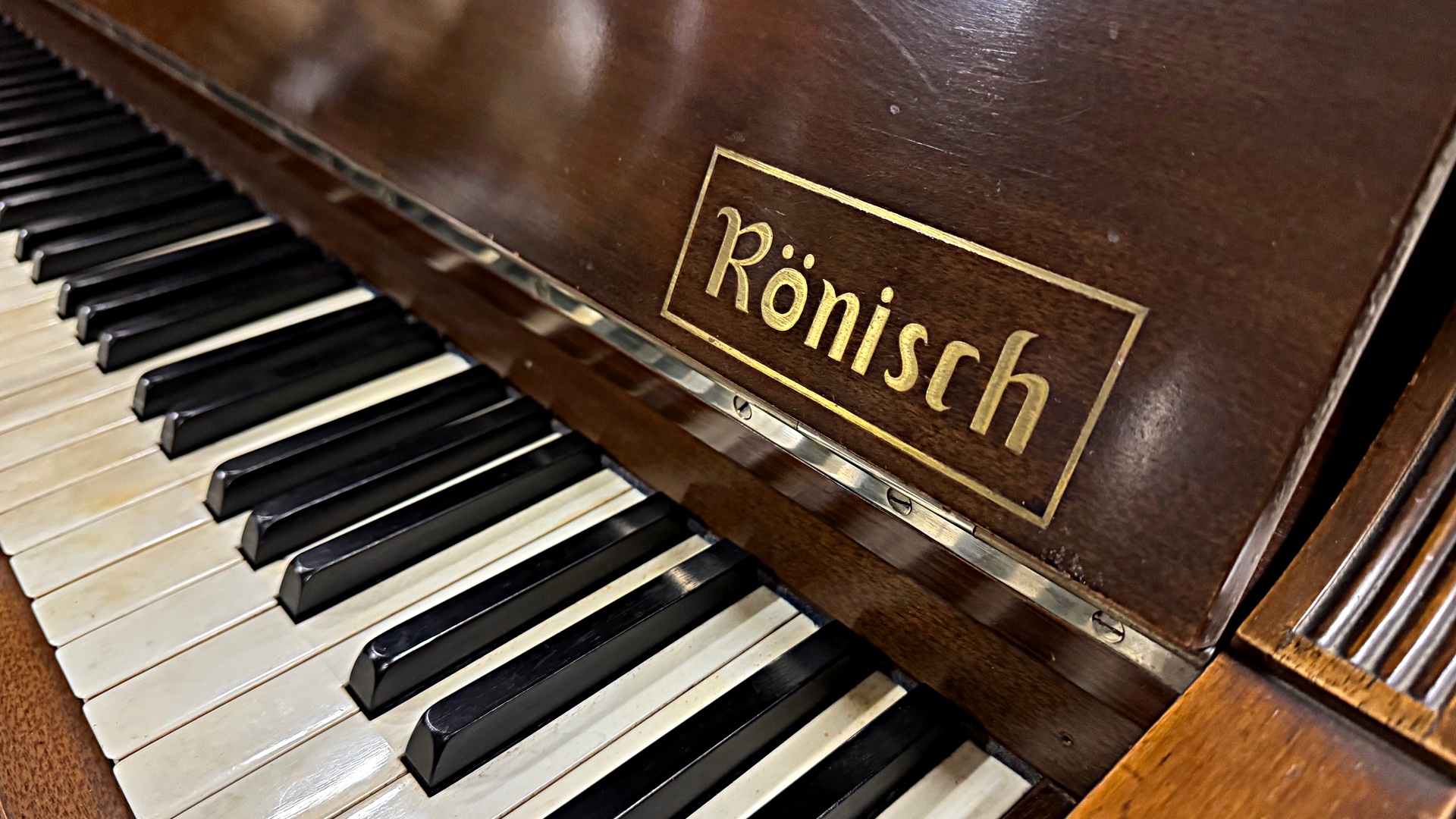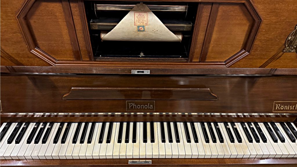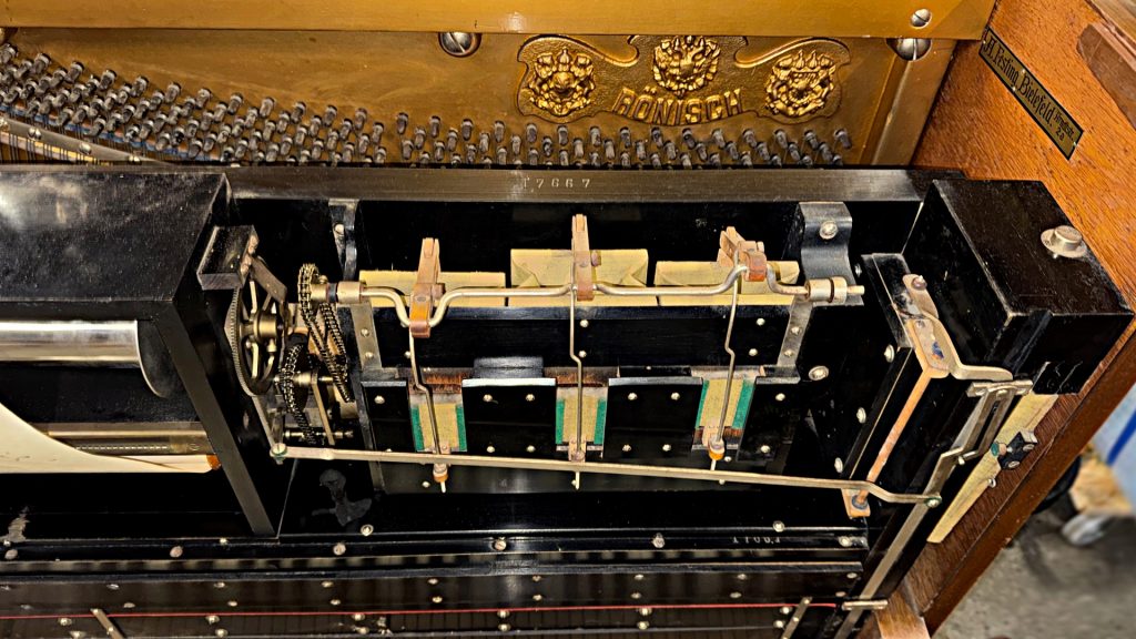Die Hausmarke Rönisch in Verbindung mit der Phonola war das erfolgreichste Selbstspielpiano von Hupfeld aus Leipzig. Dieses Instrument ist eines der letzten 73er Phonola. Es ist insgesamt sehr schön original erhalten – sogar inklusive der originalen Leuchter. Das akustische Klavier ist bis auf wenige Alterungserscheinungen gut erhalten und immer noch schön spielbar. Die Hupfeld Phonola Einrichtung muss restauriert werden. Der Holzwurm hat das Instrument vor Jahrzehnten besucht und Löcher am Sockel hinterlassen.