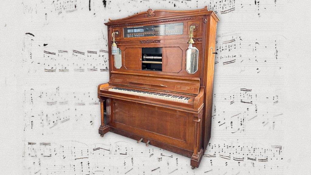 Dies ist ein seltenes Philipps Pianella Klavier in einem hohen Korpus mit Mandoline und Xylophon aus ca. 1925. Es hat noch die prächtigen originalen Leuchter. Erstausgeliefert wurde es von einem Pianohaus in Barcelona. Es hat ein anderes Rollenformat als die Pianella, die Rolle bewegt sich von unten nach oben. Wir können Pianella Notenrollen auf dieses Format Umstanzen. Das Instrument benötigt eine komplette Restauration. Die Gebläseeinheit im unteren Innenraum wurde von einem Vorbesitzer durch einen Staubsaugermotor ersetzt – wir haben von einem anderen Philipps Instrument noch die Originalteile, die dort im Zuge der Restauration wieder eingesetzt werden können. Vor langer Zeit war der Holzwurm im Piano unterwegs – die Substanz scheint aber ok zu sein.
