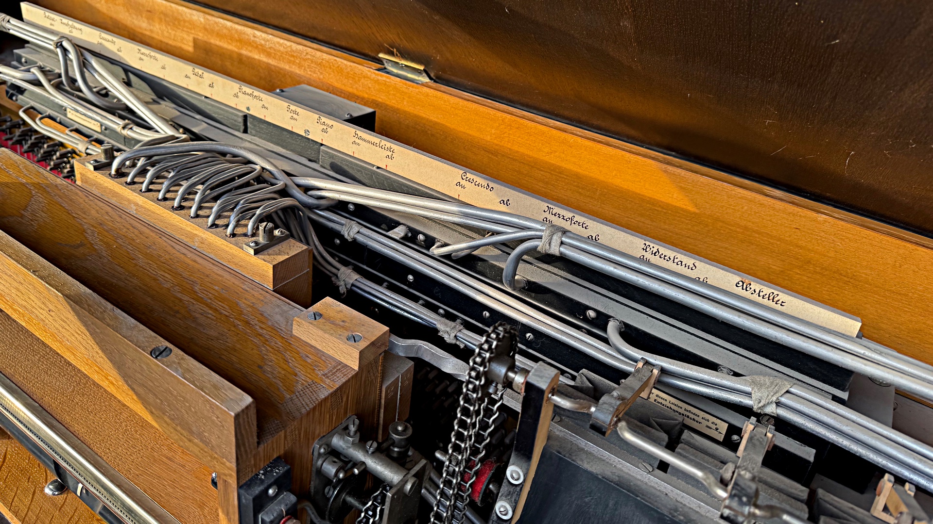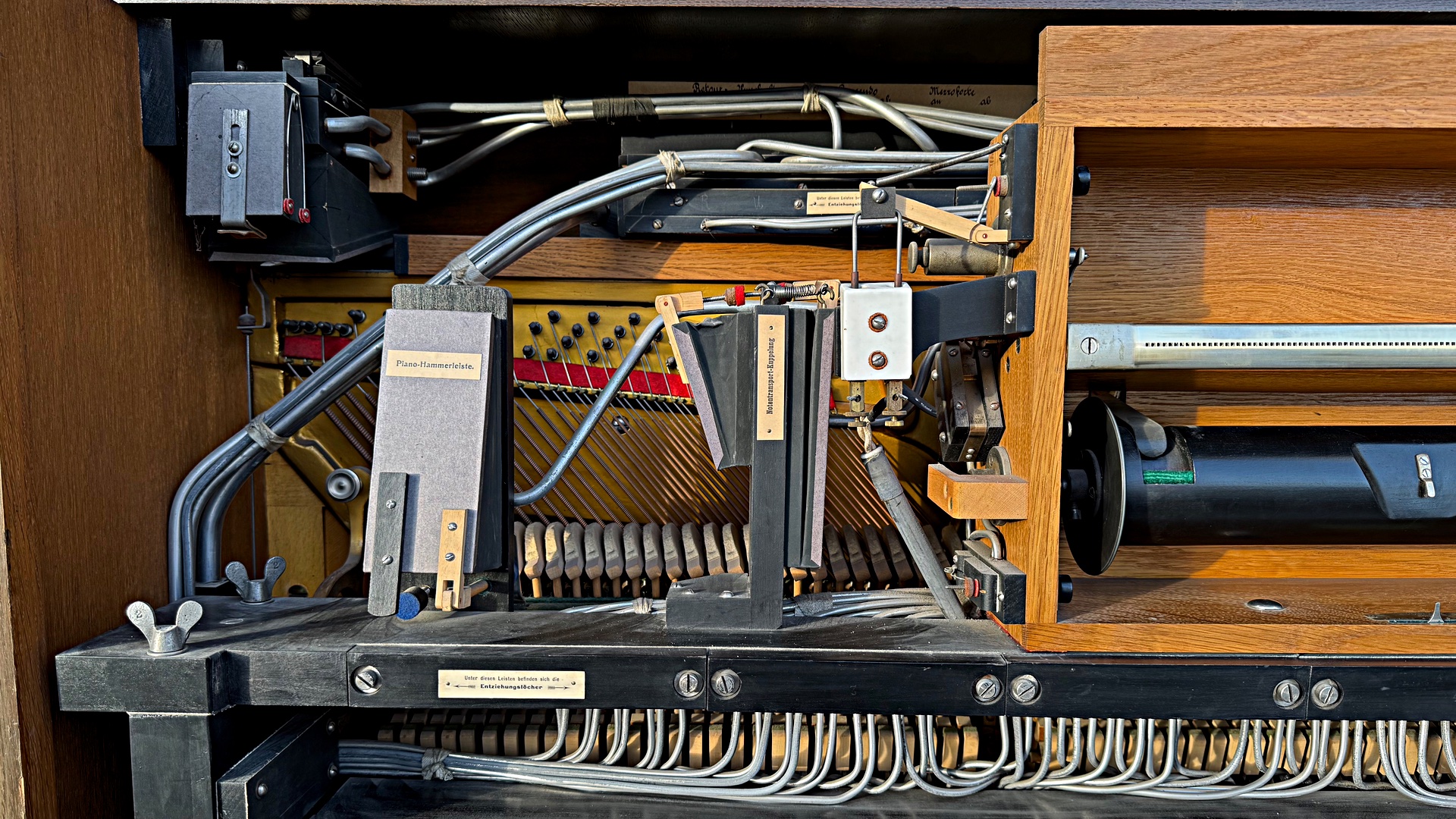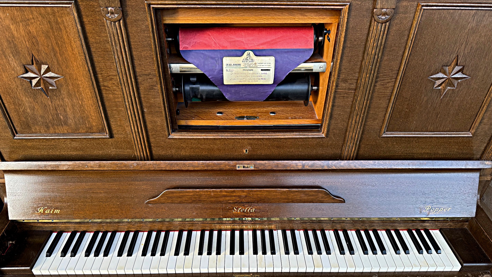 Dies ist ein sehr spätes Popper Stella Reproduktionspiano, eingebaut in ein Markenklavier von Kaim aus Kirchheim, die einen besonders schönen Klang haben. Hugo Popper hatte wesentlichen Anteil am Erfolg des Welte-Mignon. Als die Geschäftsbeziehung zwischen Welte und Popper beendet war, brachte Popper 1908 das Popper Welt Piano ‚Stella‘ Reproduktionsklavier auf den Markt, mit äußert großer technischer Ähnlichkeit zum Welte Piano – jedoch in vielen Teilen besser konstruiert. Es gab vermutlich früher über 1000 Notenrollen Titel für dieses Instrument, davon haben wir inzwischen ca. 100 aufgefunden. Durch die Ähnlichkeit der Notenrollen zu Welte-Mignon, können wir auch für dieses Piano die tausenden Welte Titel verfügbar machen.